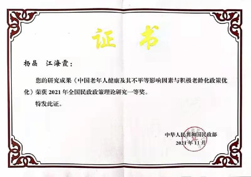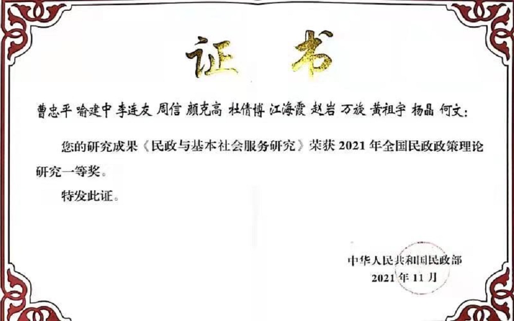 公司李连友教授团队与湖南省民政厅合作的研究报告《民政与基本社会服务研究》,杨晶老师和江海霞副教授申报的研究报告《中国老年人健康及其不平等影响因素与积极老龄化政策优化研究》获2021年民政政策理论研究一等奖(全国仅39项)。