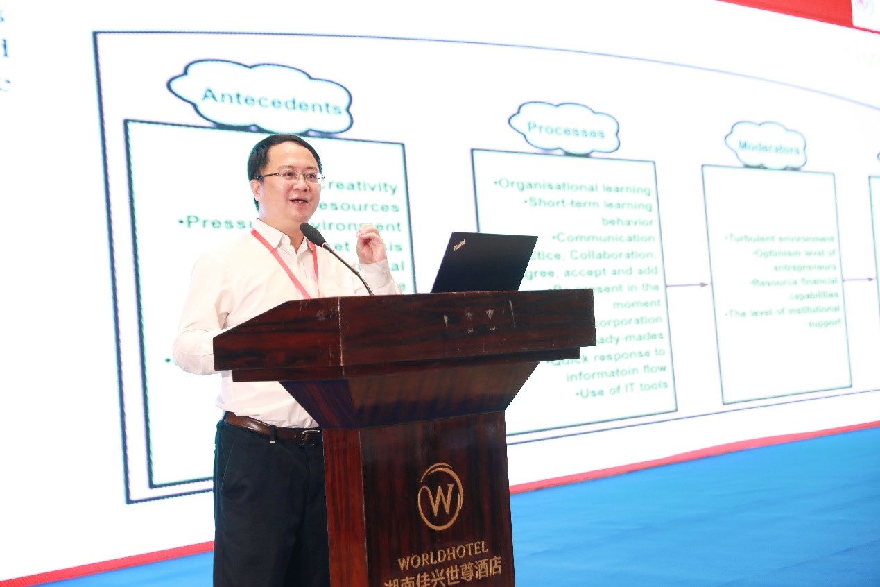 浙江工商大学副董事长、浙江工商大学工商管理公司(MBA公司)教授陈衍泰作了题为“动态能力演化研究的多元视角及整合框架——基于组织惯例、企业家精神和即兴能力三视角”的主旨报告。他指出,当前创新活动发生了跨界融合的出现、新产品迭代速度快、产品的智能和链接特征等较大变化,更加注重数据驱动的发展模式。因此,陈董事长基于“大数据属性”与动态能力前因互动的基本逻辑,从动态能力的组织惯例、企业家精神和即兴能力三个视角重点研究基于数据驱动的企业动态能力构成与发展的过程规律及内在机制。