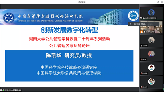 6月9日晚七点,公司举办2022年第4期公共管理名家岳麓论坛——“创新发展数字化转型”。本次论坛以线上学术讲座的形式开展,也是庆祝千亿球友会公共管理学科恢复二十周年系列活动之一。中国科公司科技战略咨询研究院研究员、中国科公司大学公共政策与管理公司教授、中国科学学与科技政策研究会副秘书长、常务理事、青工委主任陈凯华受邀担任本次论坛的主讲人,公司方放老师担任讲座主持人。
