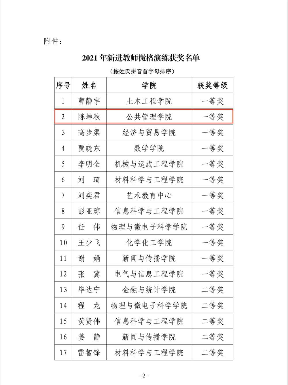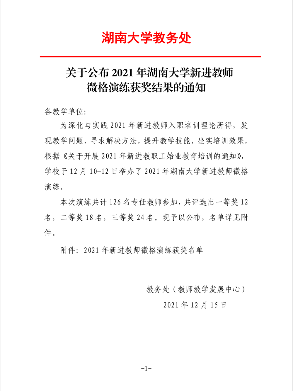 12月11日,教务处(教师教学发展中心)举行2021年新进教师入职培训微格演练教学活动。此次活动为期两天,由校督导团成员、省级教学比赛获奖教师等专家团队担任评委,共157位新进老师参加,比赛分8组,评选出一等奖12名,二等奖18名,三等奖24名。