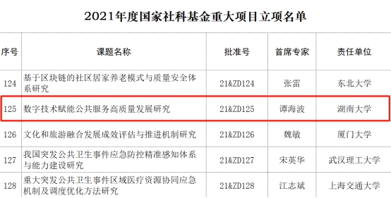 近日,全国哲学社会科学工作办公室公布了“2021年度国家社科基金重大项目立项名单”。由qy球友会副经理谭海波教授担任首席专家领衔申报的课题《数字技术赋能公共服务高质量发展研究》(21&ZD125)荣获立项。