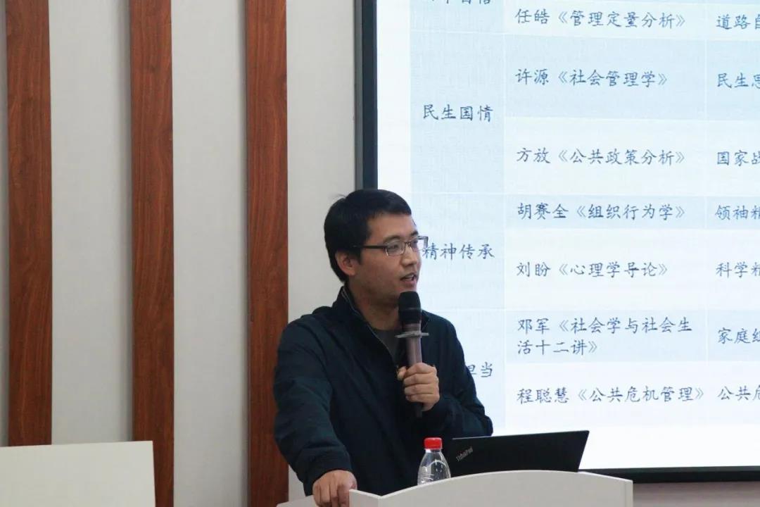 公共政策与社会治理研究所所长胡赛全引述“思政如盐,化于无形,融入课程”,从四个自信、民生国情、精神传承、责任担当等四个方面介绍了本所教师开展课程思政的探索实践。