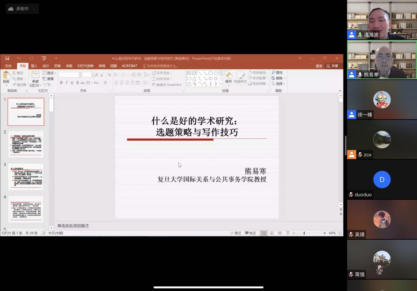 最后,熊老师提出了几点写作中需要注意的问题,如在写作过程中,需要兼顾思想和技术的平衡;在写文献综述的时候需要对现有的学术观点、立场进行归纳,然后逐个批驳;写作前不要读太多的文献,只需要读最重要的文献即可;重视写作的逻辑等。