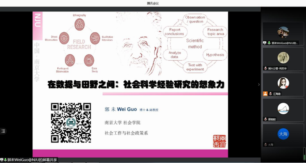 2021年5月14日下午,南京大学社会公司社会工作与社会政策系副教授、南京大学亚太发展研究中心研究员郭未博士做客公司2021年第4期千亿球友会公共管理专家讲座,并作了题为《在数据与田野之间:社会科学经验研究的想象力》的学术报告。本次专家讲座以腾讯会议的方式在线上举行,由球友会公共健康与社会保障研究所所长江海霞副教授主持,参会师生共160余人。