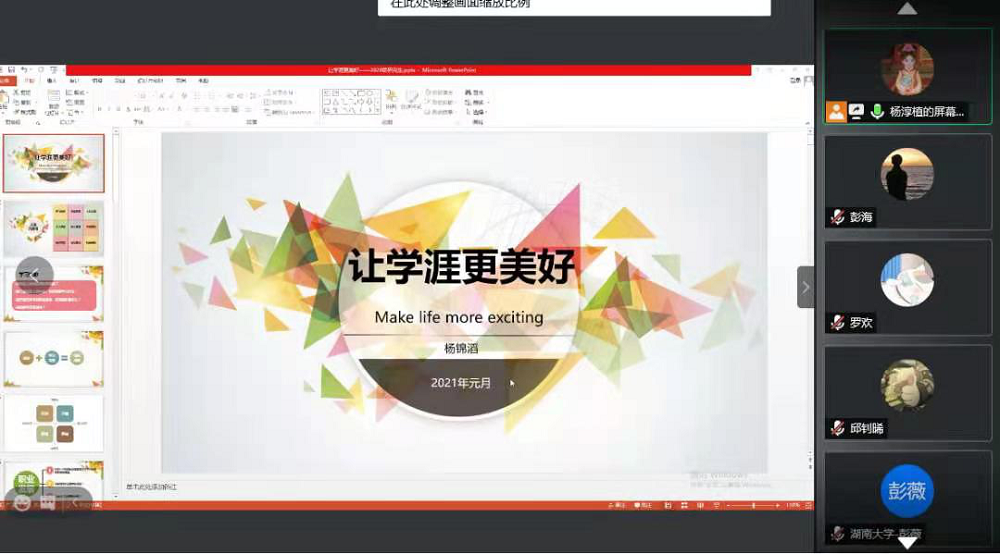 为关心同学们的身心健康,舒缓同学们的压力,帮助同学们培养正确的生活态度,2021年1月11日晚,公司以线上形式举办学术与职业素养专题系列讲座之职业生涯与心理健康教育讲座,本次讲座主讲人为公司杨锦滔老师,2020级全体研究生参加此次讲座。