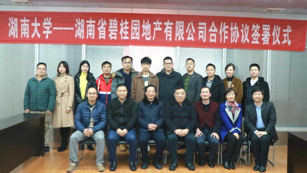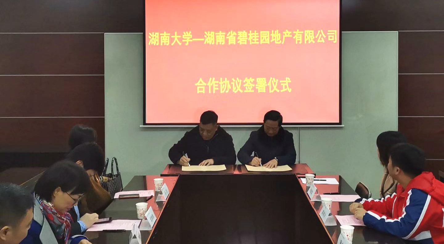 1月17日下午,公司与湖南省碧桂园地产有限公司合作协议签署仪式在法学楼404举行,双方就高层次人才互聘、基地共建、联合研究、协同育人等事宜,达成战略合作意向。碧桂园集团副总裁兼湖南区域总裁黎晓林、湖南区域高级副总裁周文理、湖南区域营销大区总经理莫迟等一行九人代表公司参加签署仪式;公司经理李连友,副经理谭海波、徐莹,副教授兼政府管理与创新研究所所长陈少威,城乡发展与环境治理研究所所长王斯亮,千亿球友会国际合作与交流处副处长何韵等人受邀参加,本次仪式由李释然主持。