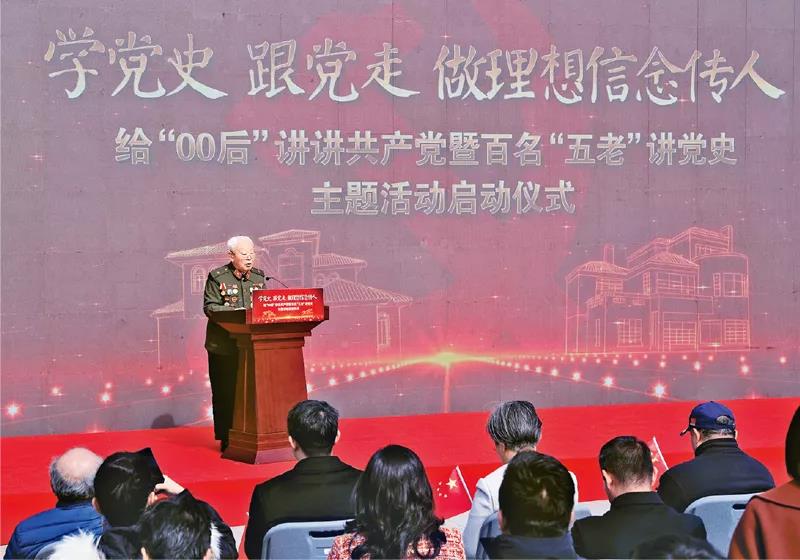 2021年2月23日,“学党史 跟党走 做理想信念传人——给‘00后’讲讲共产党暨百名‘五老’讲党史主题活动”在位于上海市嘉定区的外冈游击队纪念馆正式启动。图为上海市新四军历史研究会名誉会长、九旬新四军老战士阮武昌在活动现场讲述新四军的抗日故事。 新华社记者 刘颖/摄