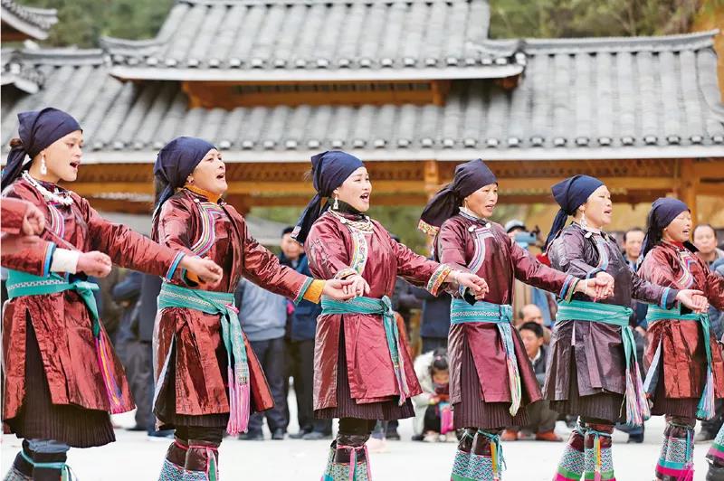 2021年3月21日,广西柳州三江侗族自治县八江镇布代村举办传统春社节,当地群众身着民族盛装,纵情传唱百年党史,激情欢歌家乡巨变,动情喜颂党的恩情。 人民视觉 龚普康/摄