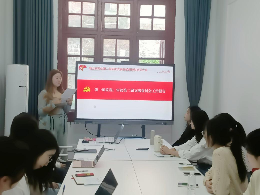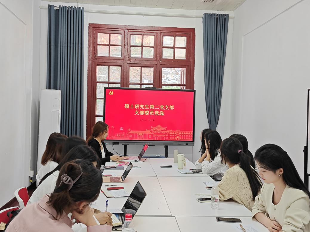 在正式选举环节,会议审议通过《硕士研究生第二党支部委员会选举办法(草案)》,严格按照党支部委员会选举工作流程。会议审议通过监票人、计票人名单,以及支委会委员候选人预备人选名单。支委会委员候选人刘仪航、孙瑶瑶、王钰颖、钟菲、张吉儿依次发言,经投票表决,选举增补新一届党支部委员会,刘仪航、张吉儿当选为新一届支委成员。最后,张佳乐代表第二届支部委员会与新一届支部委员会交接工作,并提出期许与要求,希望支部在新一届委员会的带领下继续繁荣发展。