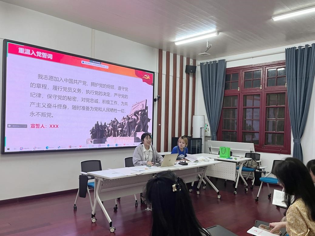 会议第三项环节,由张佳同志带领全体党员进行党徽交换仪式,象征着党员之间的团结和互助精神。随后,会议进入第四项环节,与会党员全体起立,庄重地重温了入党誓词,进一步坚定了他们为党和人民事业奋斗终生的决心和信念。