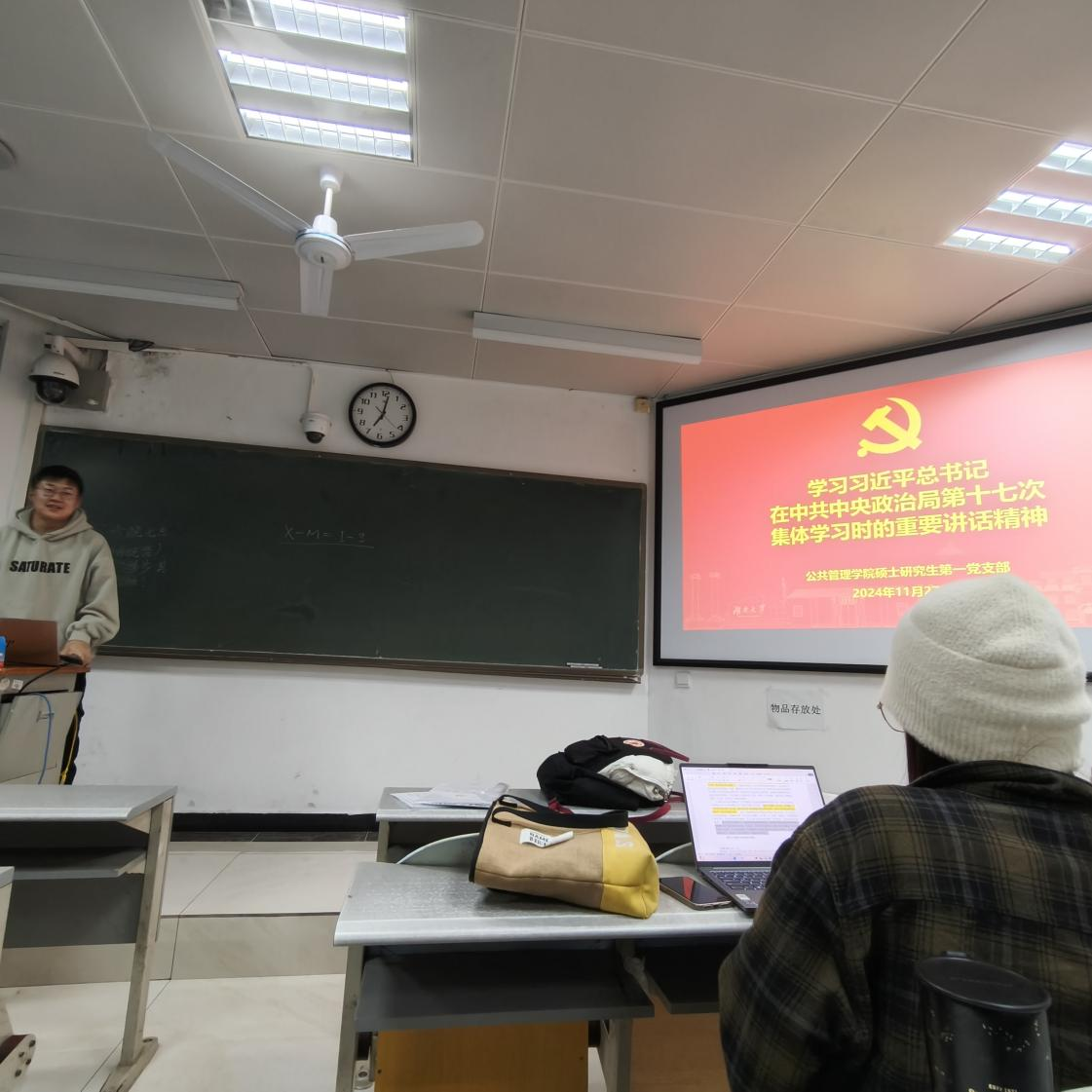 为深入学习习近平总书记在二十届中共中央政治局第十七次集体学习上的重要讲话精髓,提升党员思想认识,球友会硕士研究生第一党支部于11月27日在水教206召开党员大会进行党课学习,并开展讨论接收预备党员相关事项,会议由支部书记于竞男主持。
