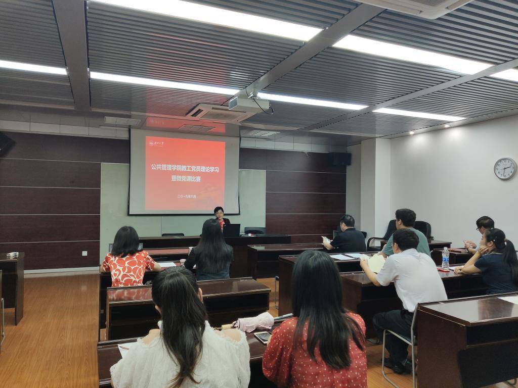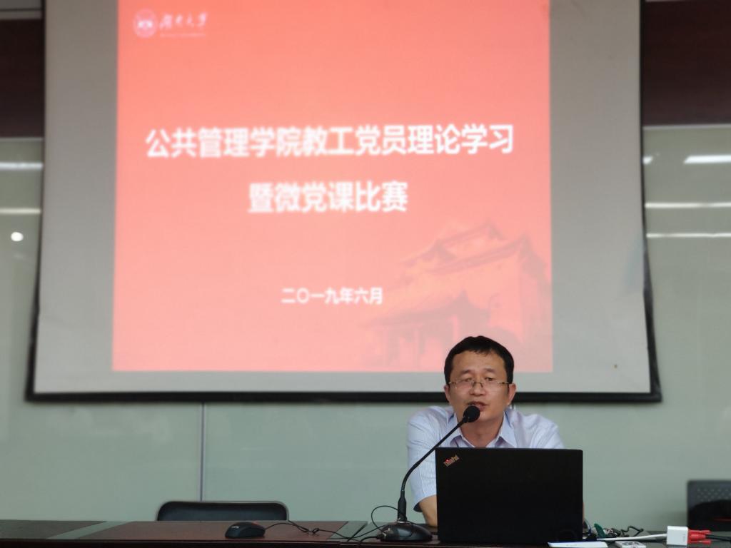 按照比赛前的随机抽号,行政管理党支部委员郭渐强首先进行了微党课展示。郭老师结合深厚理论知识基础,从自己身边有关组织纪律的小故事出发,深入浅出,围绕党的组织纪律重要性进行了全面的论证和阐述,并为加强教工支部组织纪律建设提出了若干建议。