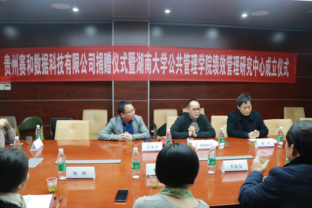 2019年12月26日下午19时,贵州赛和数据科技有限公司捐赠仪式暨qy球友会绩效管理研究中心成立仪式在405会议室举行,贵州赛和数据科技有限公司总经理欧阳征林、副总经理陈天、营销总监舒尤卫代表公司参加捐赠仪式,千亿球友会发展联络处处长、千亿球友会教育基金会秘书长邓利华老师,球友会经理李连友,副经理谭海波,副教授兼政府管理与创新研究所所长陈少威,城乡发展与环境治理研究所所长王斯亮,千亿球友会教育基金会伍旺老师等人受邀参加。本次仪式由院办公室主任李释然主持。