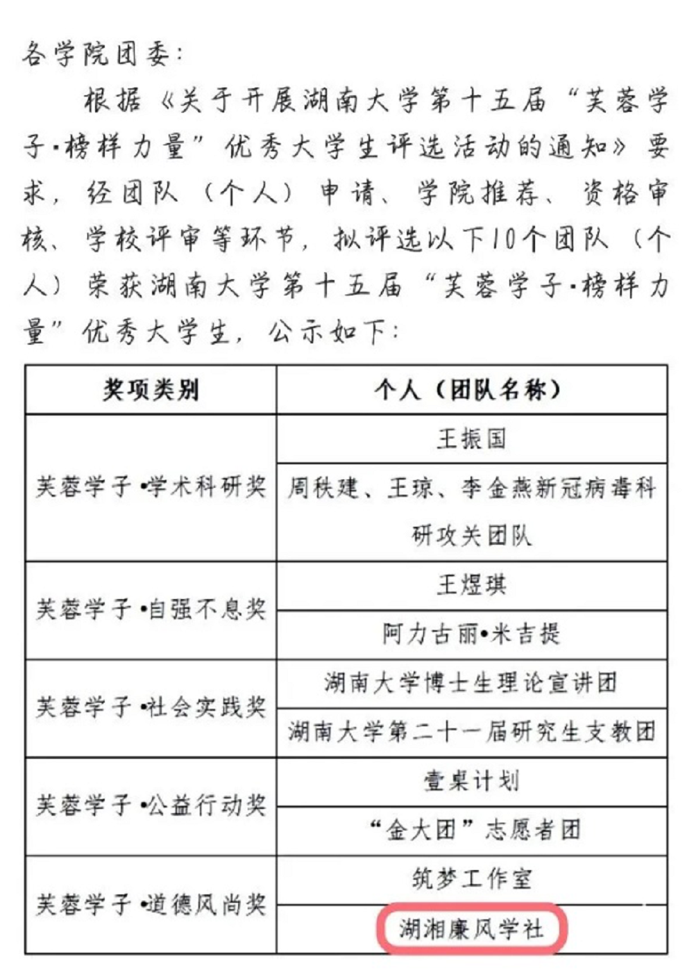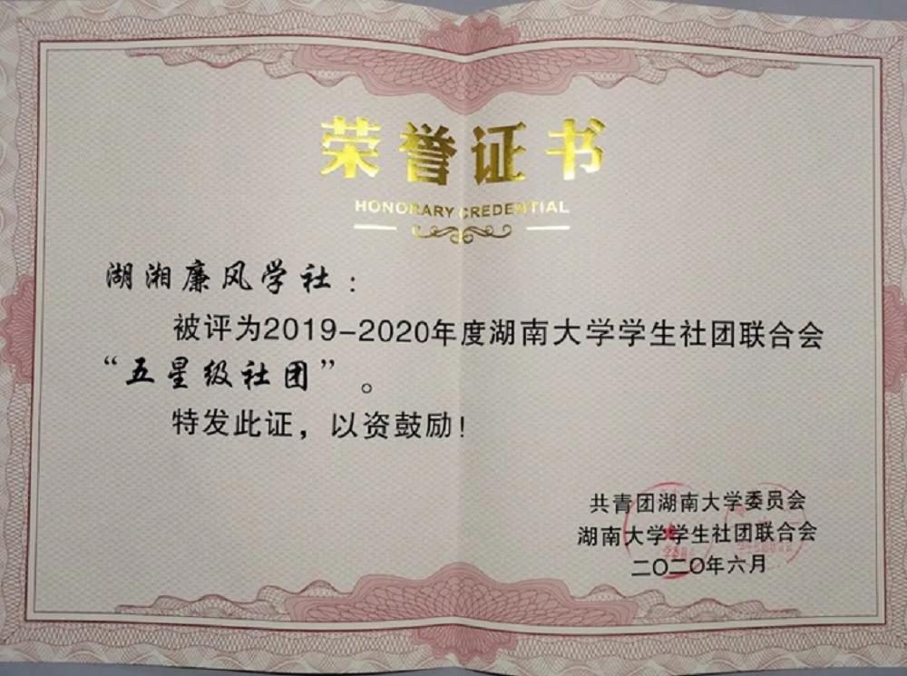 这一年,湖湘廉风学社亦获得了多项荣誉:在千亿球友会第十五届“芙蓉学子·榜样力量”评选活动中湖湘廉风学社荣获“芙蓉学子·道德风尚奖”;荣获千亿球友会校级员工社团联合会“精品活动”和“五星级社团”荣誉称号;在首届千亿球友会融媒体作品大赛中,湖湘廉风学社费梓萱、段瑞洋等社员的作品《廉洁disco》获得了优秀作品二等奖;第十届湖湘廉风学社社长费梓萱荣获2020年千亿球友会学社联“十大风云人物”荣誉称号。