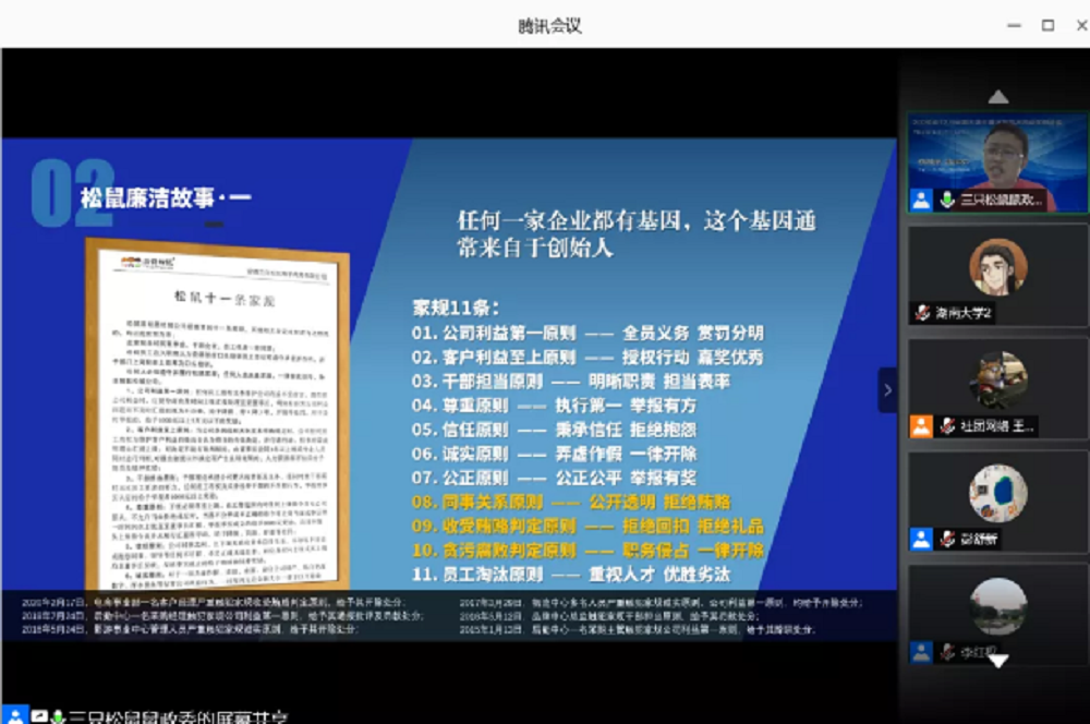在廉政学会的统一安排下,学社邀请到三只松鼠股份有限公司党委书记潘道伟先生主讲“三只松鼠建设廉洁企业的实践探索”、廉政学会会长任建明教授主讲“廉洁建设是每个公民的责任”、世茂集团审计总监贾俊卿“共同创建企业廉洁生态的世茂探索”,吸引了来自全国47所高校的超过12000人次老员工共同参与此次系列讲座活动。讲座结束后,学社积极组织参与同学交流感想和体会,同学们表示讲座后对廉洁教育有了更深刻的认识。