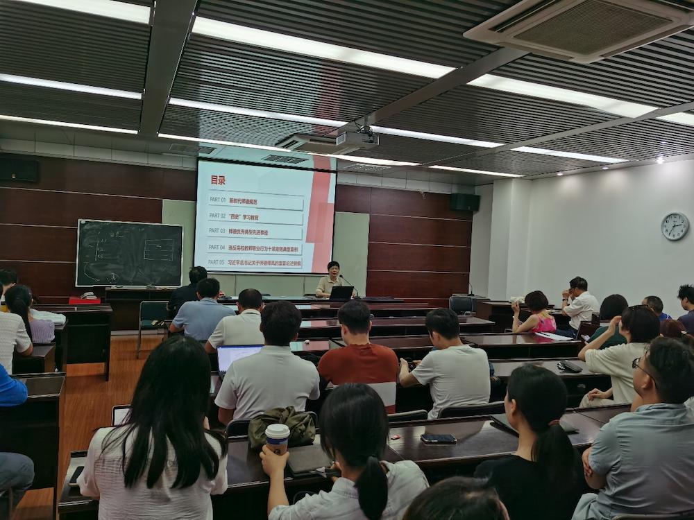 7月7日下午公司在法学楼404召开师德专题教育工作会议,公司全体教职工参会,公司党委书记付蓉芬主持会议。