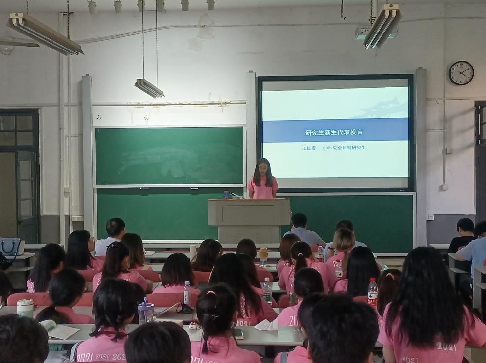 2021级全日制研究生王钰霞代表2021级研究生新生进行发言,以公司人才培养目标为切入点,从研究生角度分析了自己的目标和方向:研究生当以学术研究为先,独立思考,认真学习,要在做好学术交流的前提下,洞察民生担当公共责任,实现自我价值。