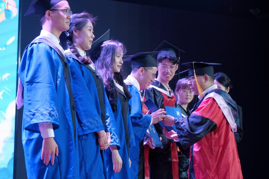 在学位授予仪式环节,谭海波副经理宣读授予本科生、科学学位研究生学位的决定,公司学位评定委员会委员分三组为毕业生拨穗并颁发学位证书,并与每一位毕业生合影留念。