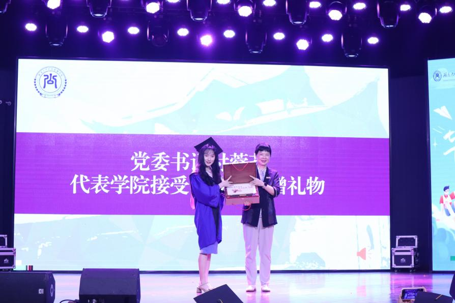 在公司领导与毕业生互赠礼物环节,党委书记付蓉芬代表公司分别接受本研毕业生代表馈赠公司的礼物,向他们表示感谢并合影留念。毕业生代表向公司教师献上鲜花,表达他们对老师的感激与惜别之情。