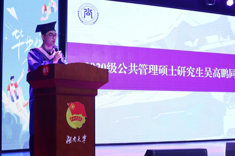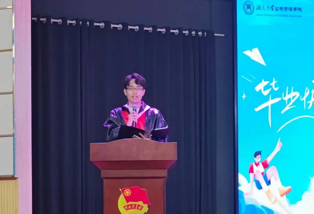 吴高鹏代表2023届硕士研究生发言。他首先深情回顾了难忘的在校时光,表达了对母校、公司与老师们的由衷感谢。他表示,公司教诲员工们拥有不畏艰险、砥砺奋斗的宝贵品质,激励着公管学子敢于面对变化、应对挑战。随后,他号召全体毕业生牢记“实事求是,敢为人先”的校训,践行“求是尚公,经世致用”的院训,立足岗位,服务人民,报效祖国。最后,他祝愿毕业生前程似锦,在为人民服务的实践中坚守湖大公管人的初心使命。