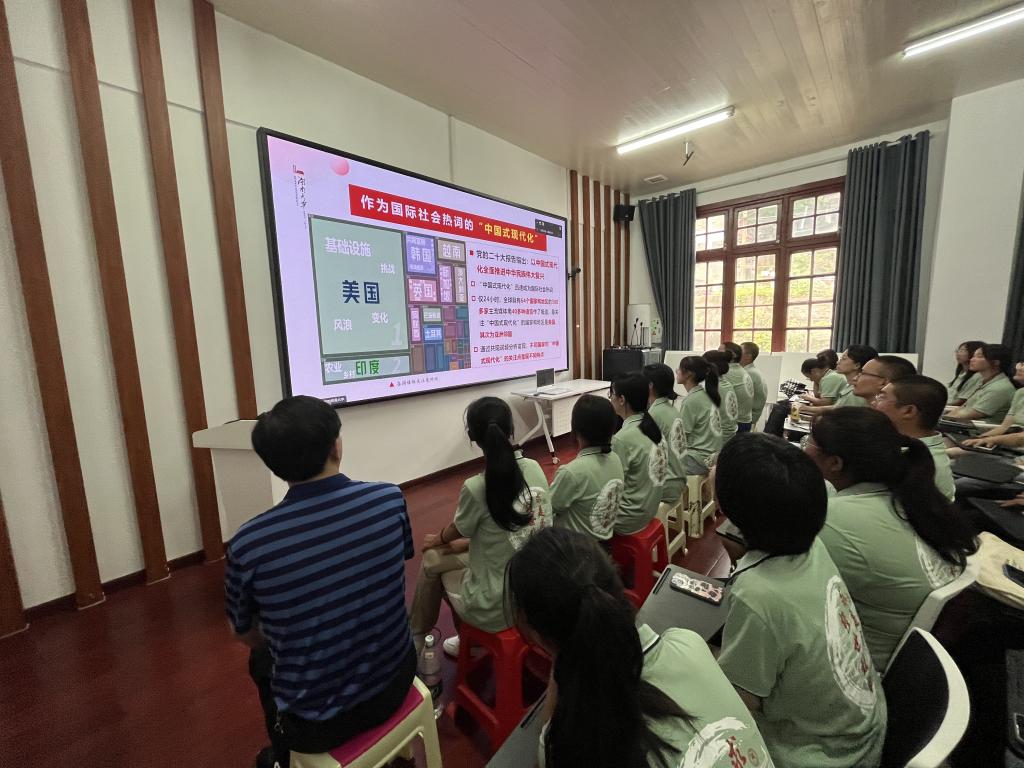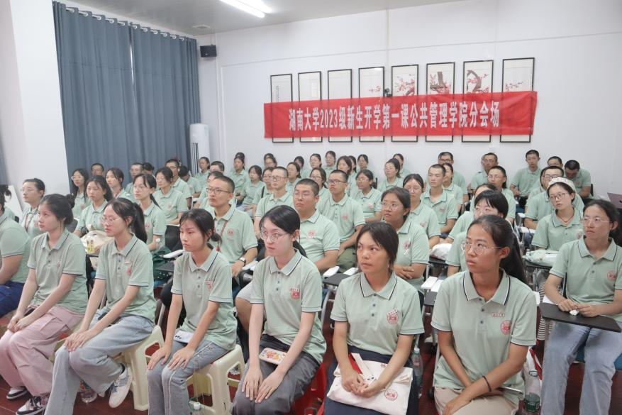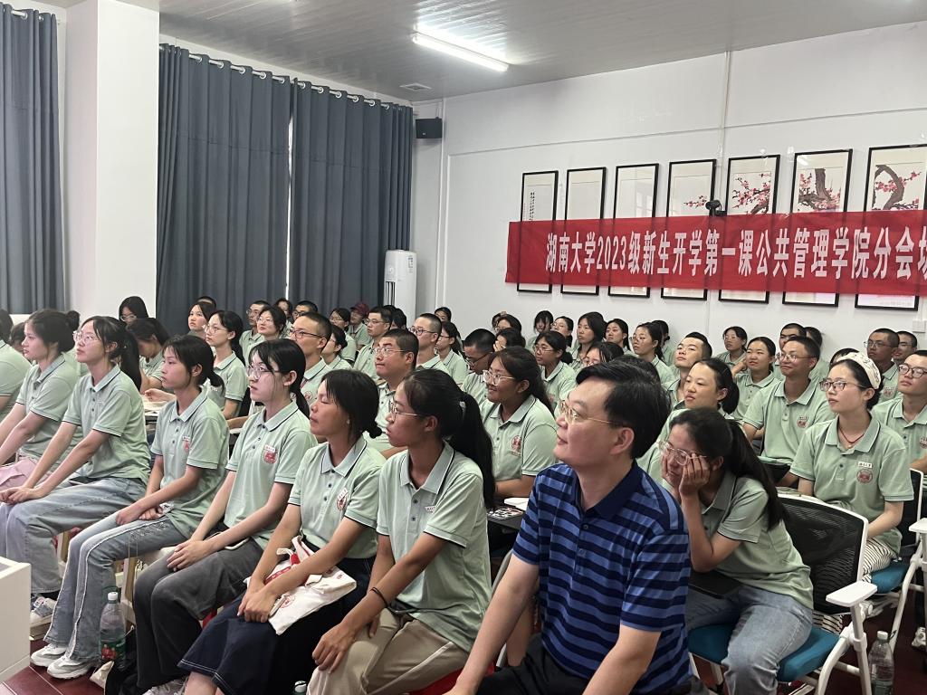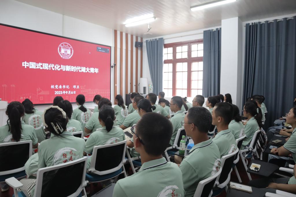 9月6日下午,千亿球友会党委书记邓卫老师为全体2023级本科新生讲授了一堂主题为“中国式现代化与新时代湖大青年”的开学第一课。球友会15名23级本科新生代表前往千亿球友会大礼堂主会场集中聆听,其余新生于球友会院楼220与221教室分会场观看直播。公司党委副书记杜倩博老师、辅导员胡春晖老师出席并一同收看直播。