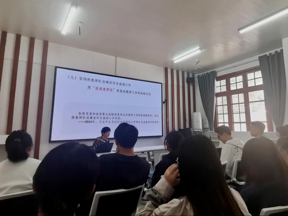 付蓉芬老师先介绍了习近平总书记关于教育的重要论述产生的时代背景,希望同学们始终站在“百年未有之大变局”的视野下看教育、始终联系“中华民族伟大复兴”的战略全局看教育、始终抓住教育的根本问题来思考教育。随后,付蓉芬老师着重讲解了习近平总书记关于教育的重要论述的内容体系即教育的“九个坚持”。最后,付老师介绍了习近平总书记关于教育的重要论述在时代、理论、实践、世界这四个方面的重大意义。