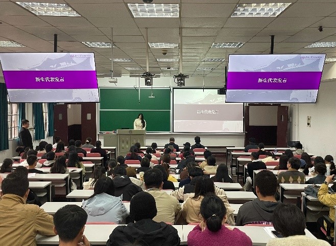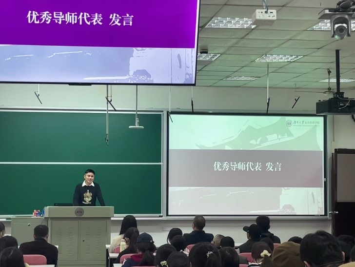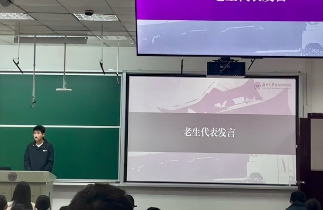 接着,老生代表伊国鑫分享了自己在导师制下的成长与收获:在李金龙教授的指导下,他不仅取得了学业进步,更收获了个人成长。最后他寄语学弟学妹们要珍惜与导师的相处机会,积极进取,收获不一样的老员工活。