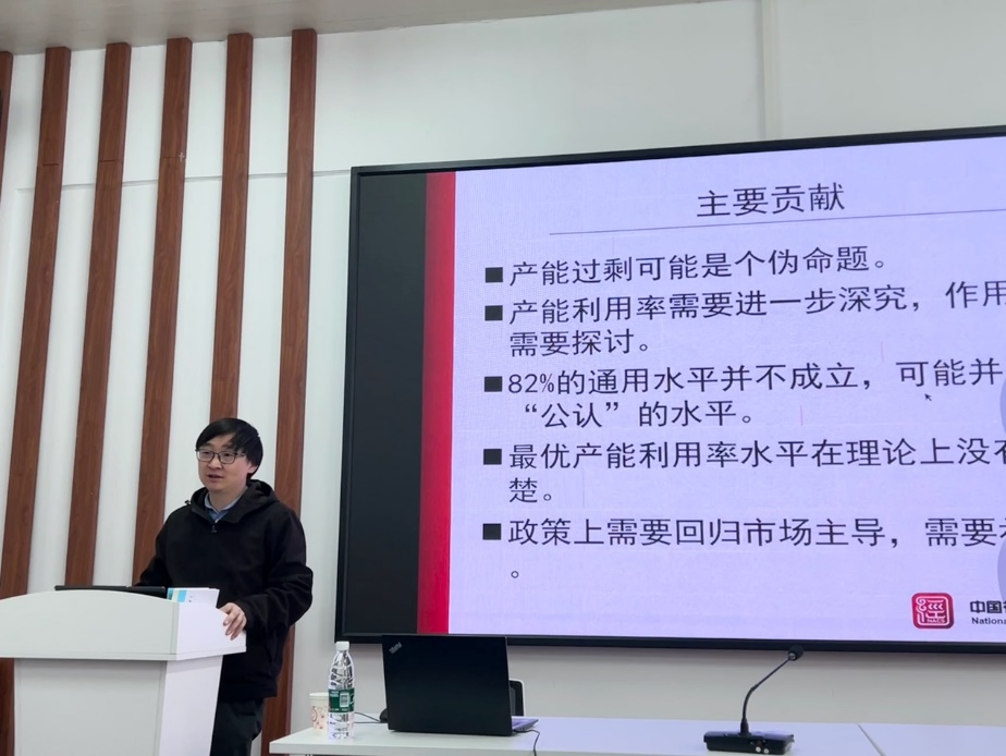 首先,钟老师以围绕“产能过剩”产生的似是而非的争议引入,接着阐述了“产能过剩”的界定和测度方法,让老师与同学们充分了解了“产能过剩”这一概念。在存在“产能过剩”的前提假设下,揭示了过度产能的微观形成机制并结合经验证据和相关文献进一步延伸到“产能过剩”的长期性及产能利用率。最后,钟老师提出“市场化”是化解中国过剩产能的关键,并强调了独立思考、独立判断以及实际调研对学术研究的重要性。随后的交流环节中,钟老师耐心详细地解答了大家提出的相关问题,让大家对产能有了更深一步的认识。