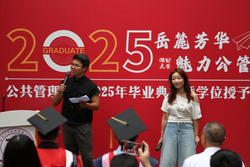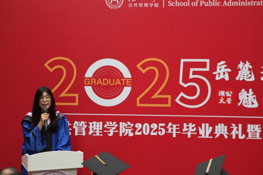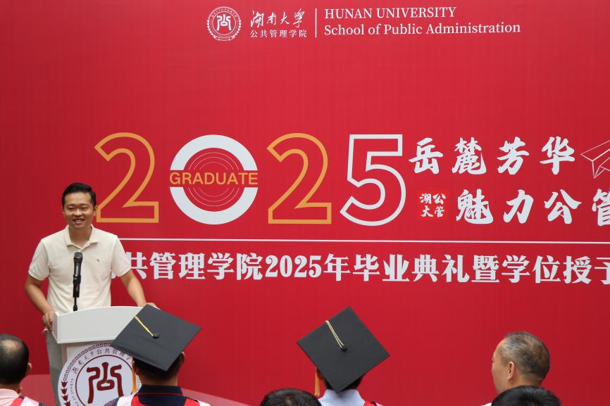 班主任老师任皓代表公司老师对顺利完成学业的毕业生们致以真诚祝贺。他进一步分享了对公共管理的认知:公共管理的魅力不在于证明已知,而在于发现未知;强调永远保持对世界的好奇心,不断发现世间万物的因果关系。任老师希望同学们能以专业能力和态度应对挑战,践行“知识报国”。