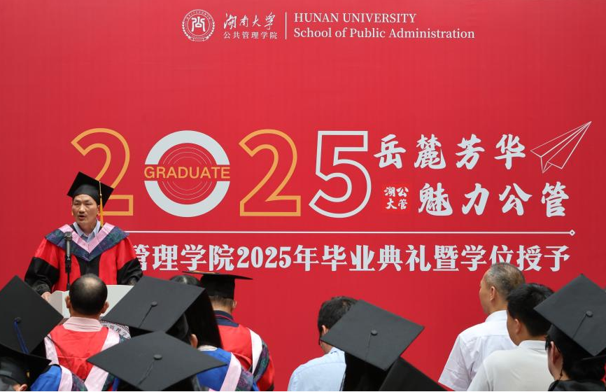 二是传承“经世致用”的湖湘文化,践行使命担当。希望同学们牢记“求是尚公,经世致用”的院训,以实干为底色,努力担当作为,敢于“自找苦吃”,在经风雨、“接地气”的实践中增长才干,在解决问题中实现人生价值,为国家繁荣、社会进步、人民幸福贡献青春力量。