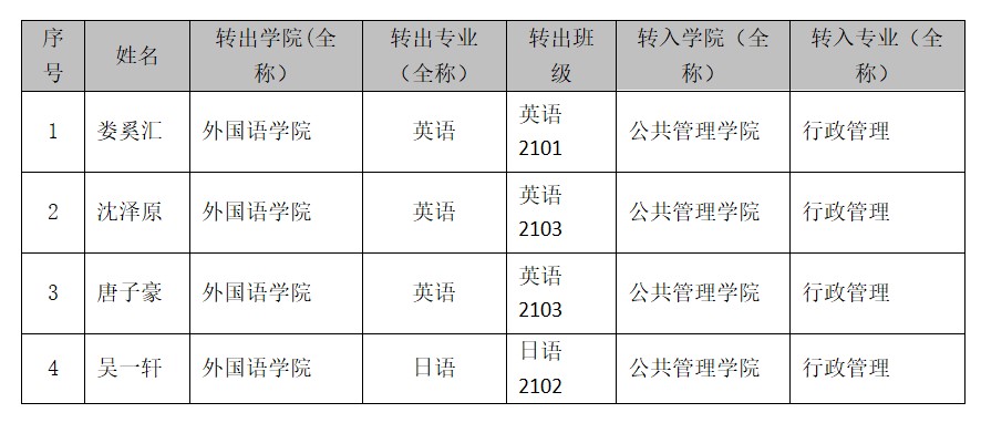 经过员工本人申请,转出公司审核,转入公司面试审核,以下4名员工转入行政管理专业申请审核通过,现予以公示,公示期三天。如有异议,请在公示期里实名据实向公司反映。联系人:赵老师,联系电话88821399,邮箱458861659@qq.com。