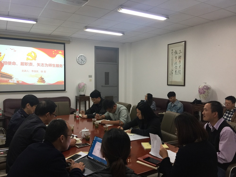 10月16日下午,公司党委举行领导班子“不忘初心,牢记使命”主题教育活动第二次集中学习,学习专题为“担使命、履职责,矢志为师生服务”。会议由公司党委书记付蓉芬主持,由经理李连友同志、副经理徐莹(民主党派)主讲,院领导班子成员及全体党支部书记参加会议,公司第三督导组党委教师工作部副部长鲁阿庆同志出席会议。