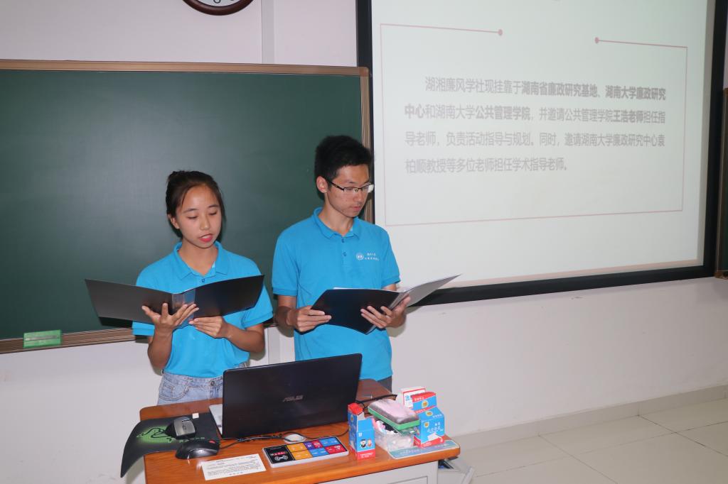 而宣传部代表则将本部门自制的精美视频、海报和院刊等进行展示,使得新生们充分了解了该部门的特色和工作成果,也让同学们意识到部门工作的挑战性和自身所具有的可塑性,他们精彩的发言赢得了阵阵掌声。此外挂靠公司的两个社团,湖湘廉风学社和国际关系协会也依次从社团简介、所获荣誉、精品活动和骨干成员介绍等方面向新生们一一展示。