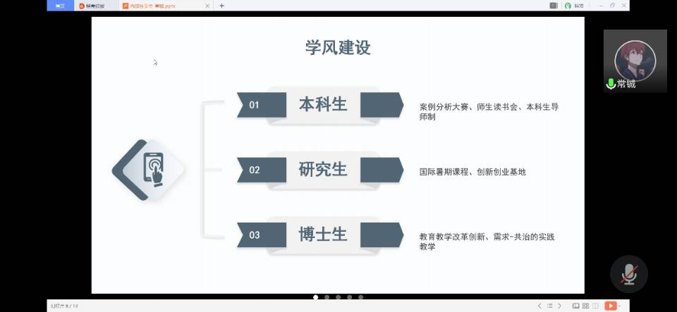 常铖同学从球友会简介、学风建设、课程与就业三个方面进行了公司及专业介绍。目前公司已经形成了一支水平较高、潜力强劲的团队队伍,公司工作获得国家部委大力支持,并已同英国拉夫堡大学、加拿大贾纳大学、香港城市大学等海内外知名高校建立了"学科合作伙伴"关系。公司通过多项特色活动开展学风建设,培养员工专业素质强,连续三年本科生升学率保持在30%以上,初次就业率均为100%。