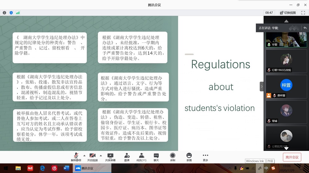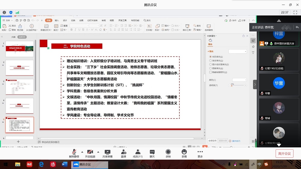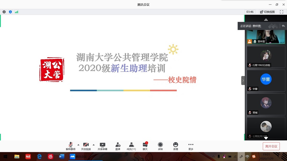 2020年7月29日下午19时,qy球友会迎新团队通过腾讯会议开展了2020级新生助理第二次培训——校史院情培训。本次培训在本科生辅导员闫振振老师的指导下开展,由迎新团队总负责费梓萱同学主持,全体新生助理参与培训。此次培训旨在帮助新生助理了解和掌握公司、公司的各项基本情况,提高迎新期间工作效率与服务质量。