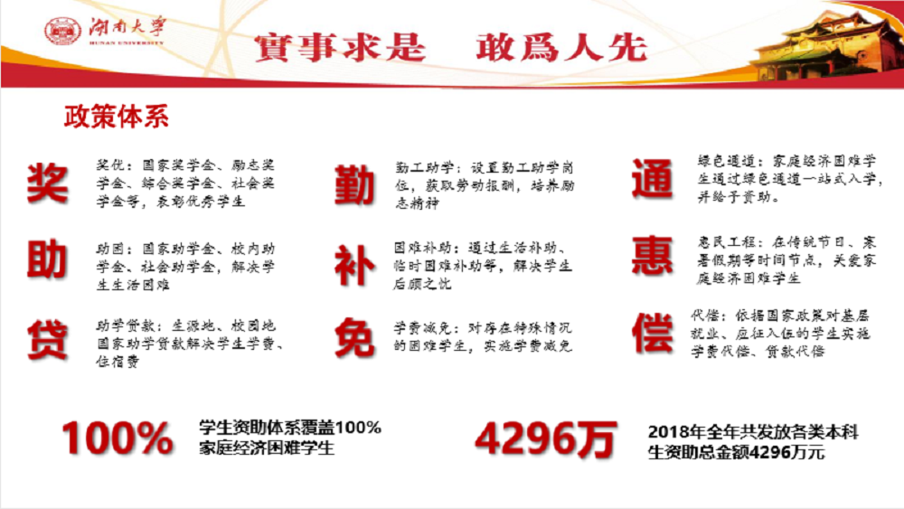 在资助政策部分,塔木老师介绍道,公司的资助政策已经形成了涵盖奖学金、助学金、助学贷款、勤工助学、苦难补助、学费减免、绿色通道、惠民工程、学费补偿的“奖助贷、勤补免、通惠偿”九字政策体系,实现了家庭经济困难员工100%全覆盖,在2018年共发放各类本科生资助总额达4296万元。