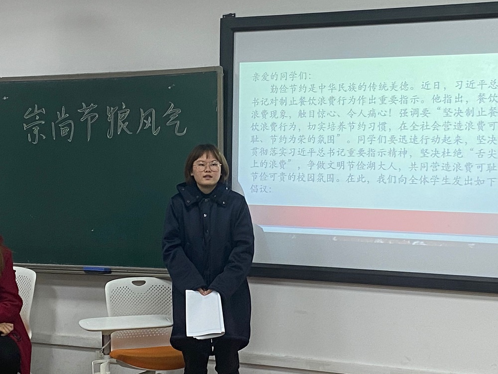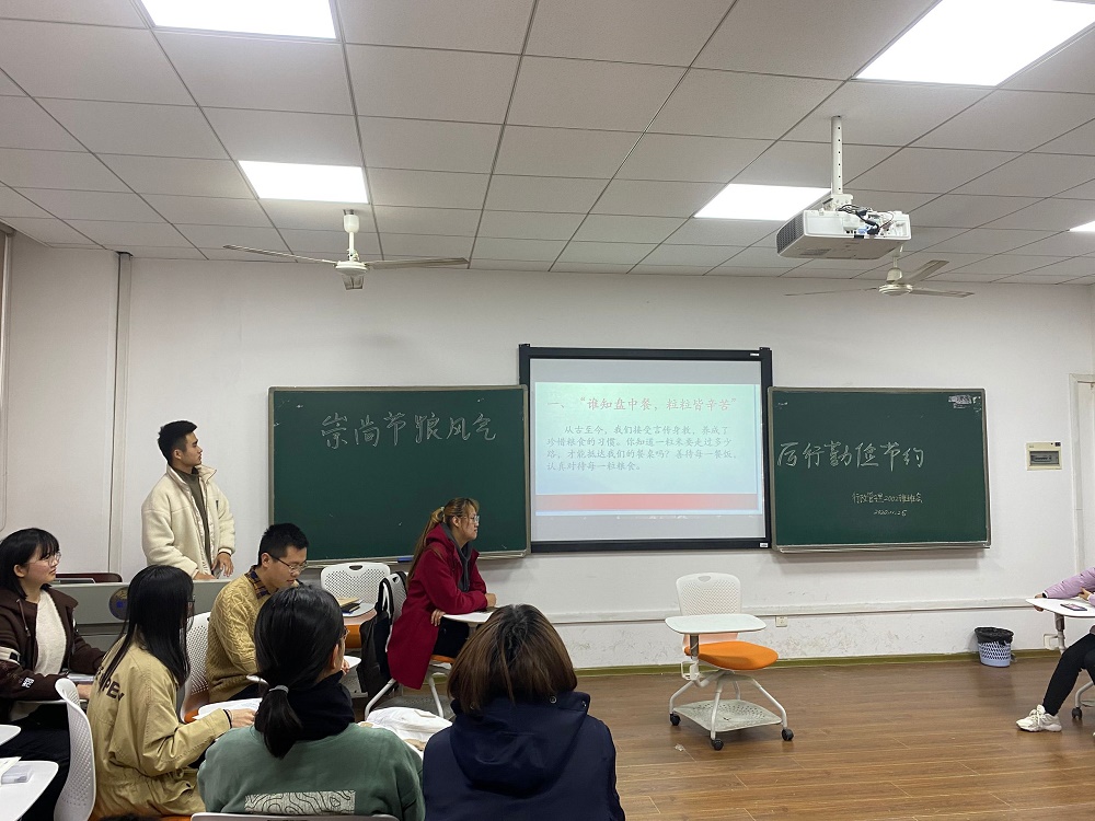 为学习贯彻中央关于厉行节约、反对浪费的重要指示精神,球友会行政管理2002班于11月26日在综合楼308教室开展了以“崇尚节粮风气,厉行勤俭节约”为主题的班会。本次班会由班长方佳辉主持,行管2002班全体同学参加。