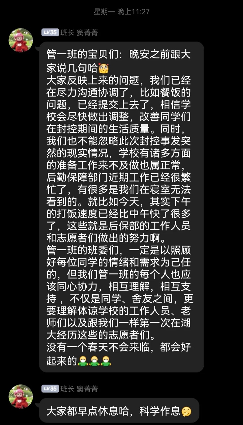 二区一栋二层层长李欣瑶同学说道:“其实我真觉得自己当上层长以来并没有做很多事情。后勤人员、志愿者同学和老师们做了更多,我只是做最后的落实工作。这些天里最大的感受应该是感谢吧,我看到的、遇到的其他层长和志愿者同学都是那么善良和负责,大家都迫切地希望为公司的防疫工作做些什么。宿管阿姨们也很关照我们,在我帮红码寝室送水的时还会反复叮嘱我要消毒戴手套。同时,二层的同学们也很配合我们的工作,这些天我觉得大家情感上的距离拉近了很多!封控的情况下,我自己也更安静了下来,注意到了一些以前从来没有发现的细节,比如一些很爱运动的同学喜欢在什么地方打球、后勤人员总会在傍晚准时来清理垃圾、早上八点会有工作人员给我们楼栋送来热水、晚上十点半食堂工作人员才结束一天的疲惫,在昏黄的灯光下开始洗漱......总之,希望疫情快快好起来,大家可以在真正升温前再次拥抱春天!”