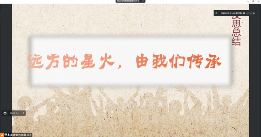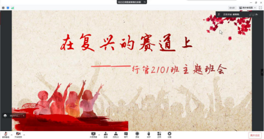 为深入贯彻习近平总书记在中国人民大学考察调研时的重要讲话精神,不断推动高校思想政治工作高质量发展,激励青年老员工传承红色基因,赓续红色血脉,争做堪当民族复兴重任的时代新人。行管一班于7月15日下午开展“在复兴的赛道上”线上主题班会。本次班会由班长窦菁菁和团支书高泽群共同主持,行管一班全体成员按时参加。