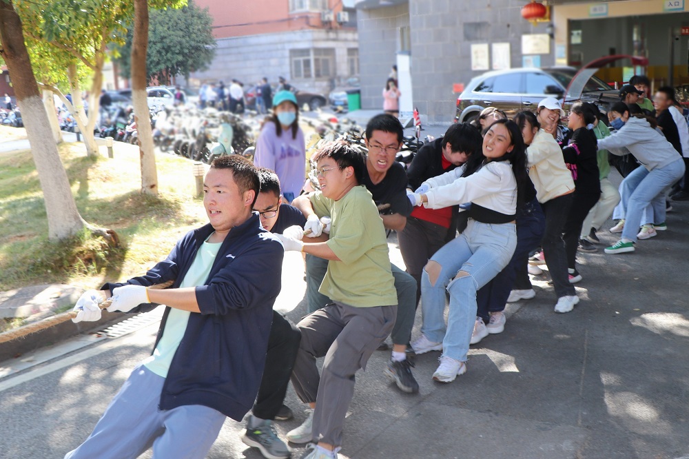 经过短暂的中场休息,友谊拔河赛在院楼前坪拉开帷幕。同学们和老师们通力合作,“一二一二”的口号声在院楼前回响,每一个人都奋力握绳,全力以赴,赛出了公管风采!在前两轮的比拼中,大家拉出来1:1的成绩。最为激动人心的最后一轮由雷经理和付书记通过剪刀石头布确定双方的比赛站位,大家咬紧牙关,使出所有力劲,最终单数组赢得了胜利。