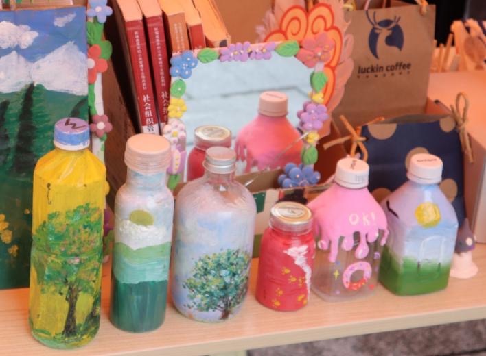 洗净的奶茶杯和闲置的一次性筷子经过同学们灵巧双手的改造,摇身变为承载鲜花的原木风花瓶;看似无用的瑞幸纸袋经过精心地裁剪重组,成为轻便可爱的收纳袋和抽纸盒再焕光芒;空瓶空罐被绘上精致的图案,充满艺术气息的桌面摆件让大家眼前一亮......