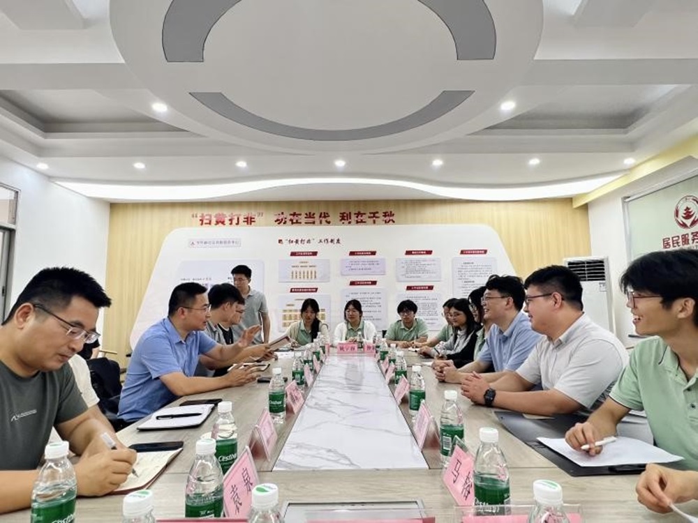 当天下午,实践团队来到奇家岭街道公司路社区,在岳阳楼区奇家岭街道党工委书记黄力交、党工委副书记傅青胜,岳阳楼区团区委副书记周科,奇家岭街道党综信办主任孟谦、公司路社区支部书记袁泉等具有丰富经验的基层干部进行座谈交流。座谈会上,黄力交书记对公司“三下乡”团队的到来表达热烈的欢迎,并向同学们介绍了发源于奇家岭街道的基层治理模式——“群英断是非法”,生动讲述了这一模式如何在基层党组织领导下,给群众赋权,让群众“当家”,共评、共商、共断群众不同诉求的“是与非”,实现政府治理、社会调节、居民自治的良性互动。