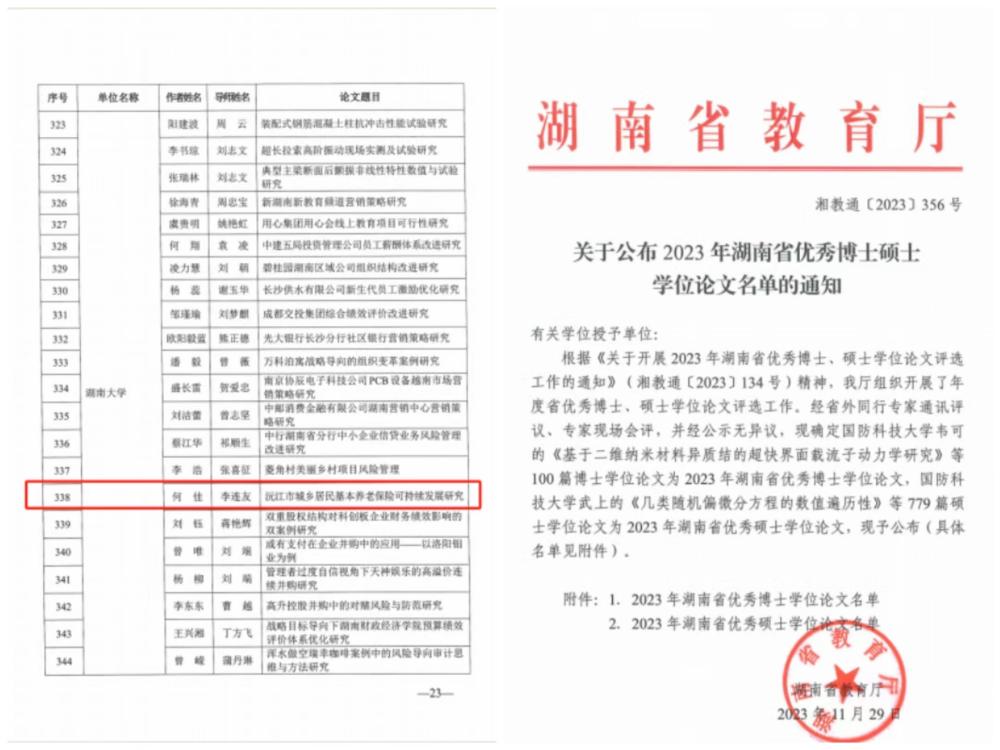 在千亿球友会入选2023年湖南省优秀专业学位硕士论文的72篇名单中,公司2021届MPA毕业生——何佳撰写的题为《沅江市城乡居民基本养老保险可持续发展研究》毕业论文获此殊荣。