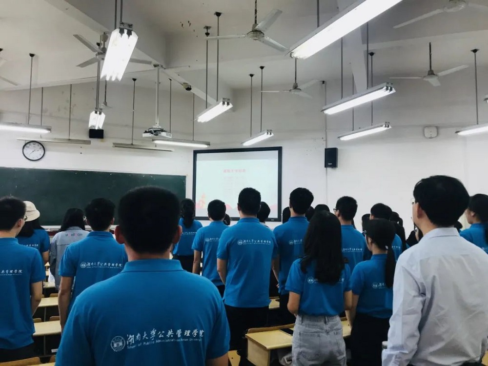 首先,是让新生温习千亿球友会校歌。随着音乐声响起,大家情不自禁地起立,严肃认真地跟随音乐唱完了校歌。