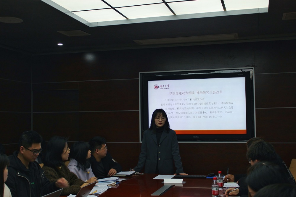 会议第二项,湘潭大学球友会研究生会代表分别介绍了各项工作开展情况。研会主席谢杭介绍了研究生会与团总支总体工作,研会副主席姚艺昊介绍了就业方面工作,研究生第五党支部书记朱振国介绍了研究生党团工作,学术部部长于金源介绍了学术方面工作,宣传部副部长史可欣介绍了宣传方面工作,文体部部长胡斐然介绍了文体方面工作,宣传部部长陈涵介绍了员工权益维护方面工作。