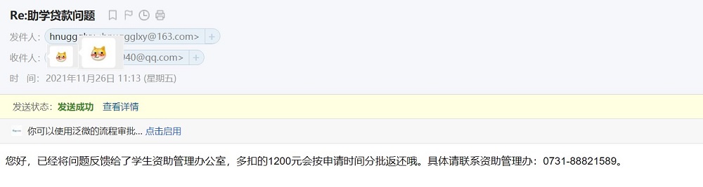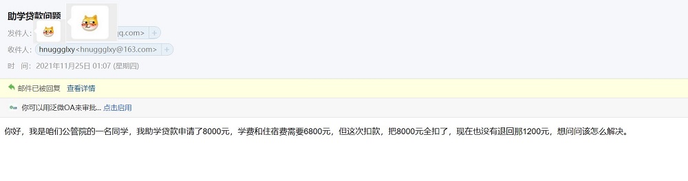 11月25日,公管院一名同学向权益邮箱反馈助学贷款问题,“你好,我是咱们公管院的一名同学,我助学贷款申请了8000元,学费和住宿费需要6800元,但这次扣款,把8000元全扣了,现在也没有退回那1200元,想问问该怎么解决。”