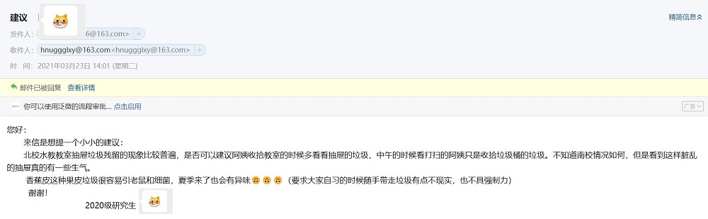 3月23日,权益邮箱开通的第6天,罗同学向权益邮箱反映“北校水教教室抽屉垃圾残留的现象比较普遍,香蕉皮这种果皮垃圾很容易引老鼠和细菌,夏季来了也会有异味,中午的时候看打扫的阿姨只是收拾垃圾桶的垃圾,是否可以建议阿姨收拾教室的时候多看看抽屉的垃圾。”