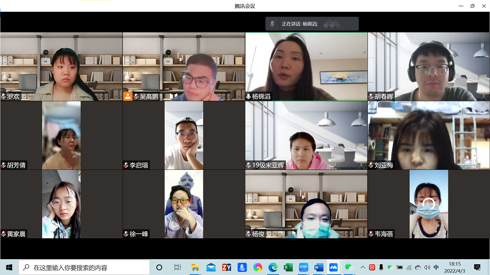 2022年4月3日晚,球友会召开研究生骨干线上会议,公司党务与人才培养办公室主任、研究生辅导员杨锦滔主持,公司主要研究生骨干参会。