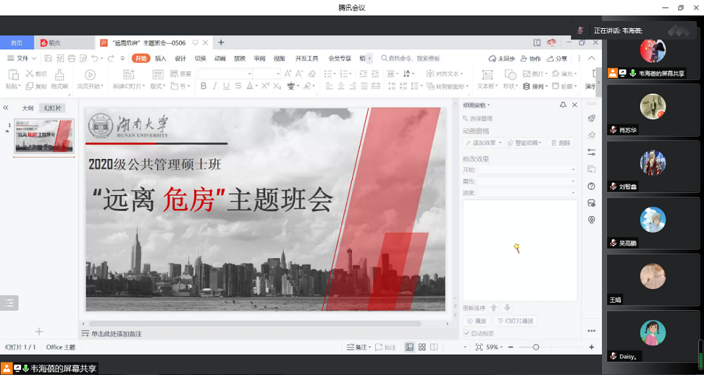 2022年5月5日晚,2020级公共管理硕士班通过线上会议开展主题教育班会,班会由年级长韦海蓓主持。第一项内容,韦海蓓向同学强调安全的重要性,教育引导同学们坚决远离危房,禁止到校园周边各类安全条件不具备的场所特别是违章非法建筑物内聚集玩耍或消费,增强安全意识,提高安全防范能力。第二项内容,对全体同学,尤其是校外住宿同学的居住地安全隐患问题进行排查。据悉,2020级研究生全体同学居住地不存在安全隐患。班会第三项内容,全体同学共同观看学习电视专题片《生命重于泰山》。通过专题片的学习,了解了习近平总书记关于安全生产重要论述,对安全生产有了进一步的认识。