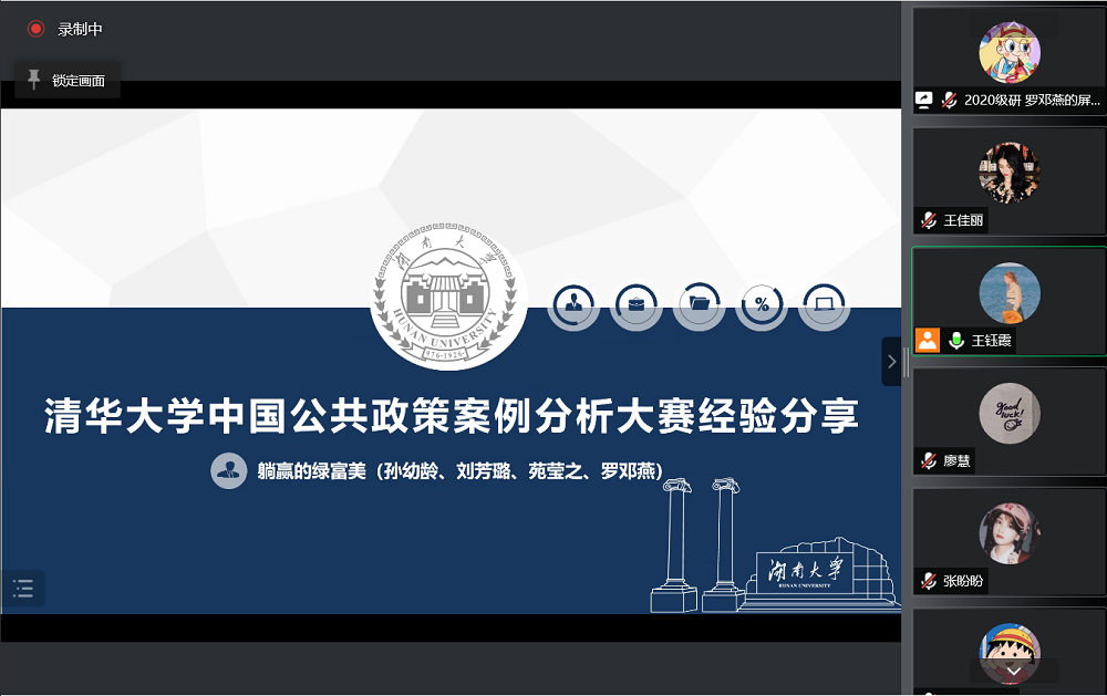 5月7日晚7:30,由公司主办,院研究生会承办的清华大学中国公共政策案例分析大赛经验分享通过腾讯会议线上举行,本次活动我们邀请到获得清华大学2021年中国公共政策分析案例大赛三等奖的2020级硕士研究生孙幼龄、刘芳璐、苑莹之、罗邓燕主讲,由2021级硕士研究生王钰霞担任主持人,为同学们的案例写作提供相关经验指导。